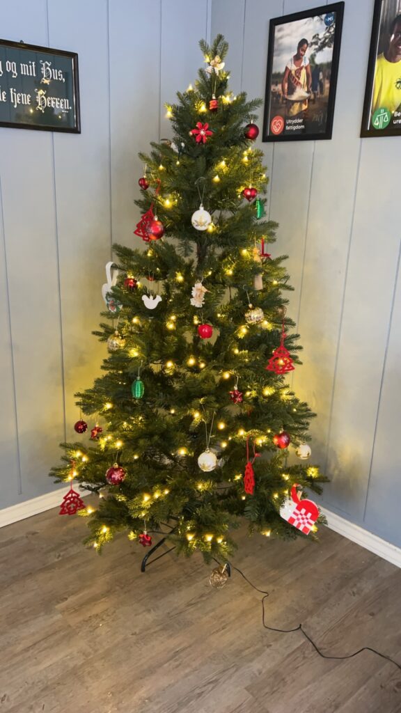 utsnitt av et juletre med julekuler og lys
